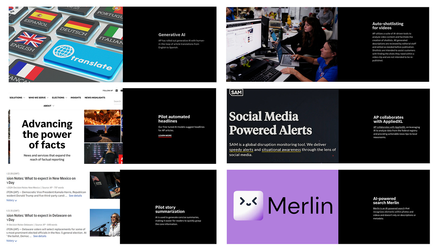 An overview of some of the AI tools the AP offers for it members (screenshots AP, composite view News Machines)