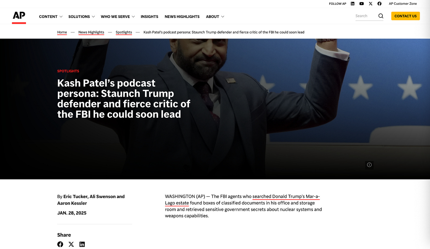 The tool proved its worth for tracking statements of Kash Patel when he was the nominee for the position of FBI director in January 2025. "There were more than 100 podcasts that Kash Patel was in, and we wanted to know what was he saying on there," Rinehart explained. The system worked so well that it became the first time the AP listed not only the bylines of the three reporters who wrote the story but, at the end of the story, also AI Product Manager Ernest Kung. He developed the tool that enabled the research.