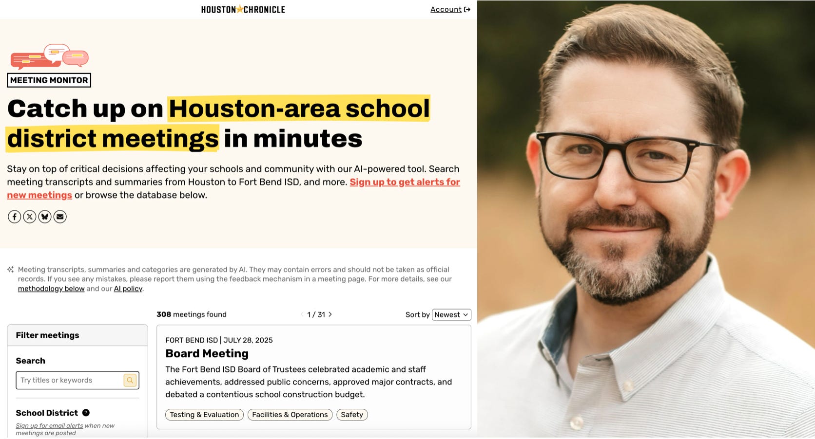 Left: The Houston Chronicle’s Meeting Monitor is the latest tool fresh out of the DevHub. Right: Tim O’Rourke (Screenshot and photo courtesy of O’Rourke)